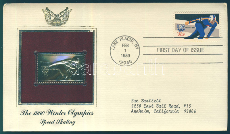 Amerikai Egyesült Államok 1980. "Téli Olimpia '80/gyorskorcsolya 15c" ... https://www.darabanth.com/en/159-Online-auction/159.0/Numismatics/Gold-foil-stamps~1200153/Amerikai-Egyesult-Allamok-1980-Teli-Olimpia-80gyorskorcsolya-15c-aranyfolias22kt-belyeg~II504058