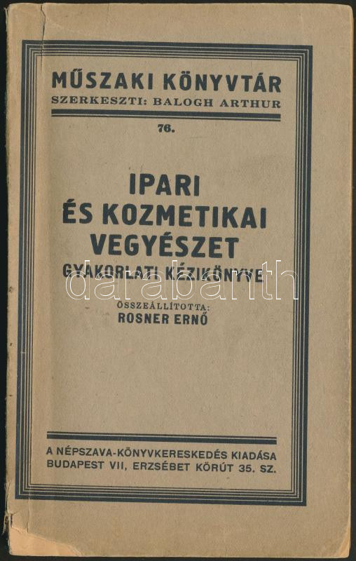 Rosner Ernő: Ipari és kozmetikai vegyészet gyakorlati kézikönyve. Bp, é.n., Népszava-Könyvkereskedés. Viseltes papírkötésben, jó állapotban