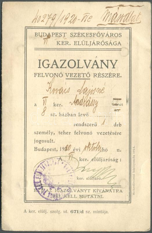 1920 Felvonó kezelő fényképes igazolványa. Andrássy út 8. sz. ház felv...