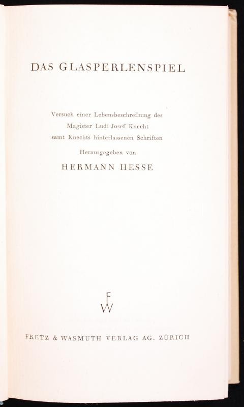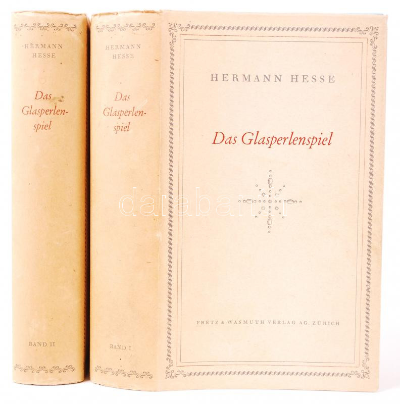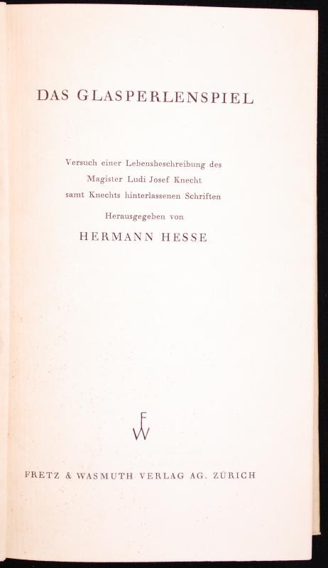Hermann Hesse: Das Glasperlenspiel I-II. Zürich, 1943, Fretz & Wasmuth. Kiadói, aranyozott, egészvászon kötésben, védőborítóval, kartontokban, megkímélt állapotban. Első kiadás (a kartontok sérült) /