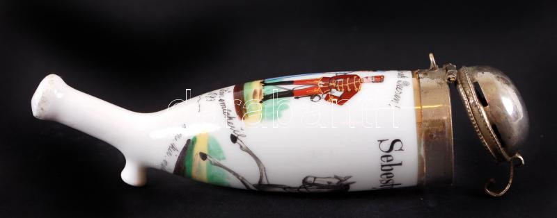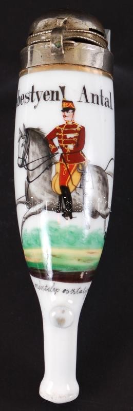 Kézzel festett porcelán pipa, fém szerelékkel, "Szolgálati időm emlékéül 1893", " a.m.kir. méntelep osztályánál Decsen" feliratokkal, hibátlan, apró kopás nyomok, m:14 cm