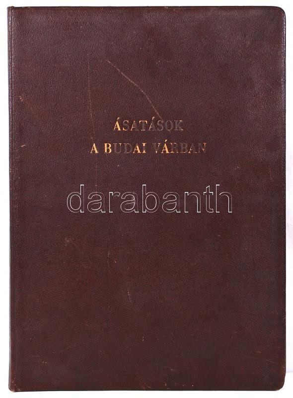 Description: 1950 Ásatások a Budai Várban. Hivatalos album 69db beragasztott, feliratozott fényképpel, térképmelléklettel, aranyozott egészbőr kötésben (a címlapon kivágás), 44x32cm