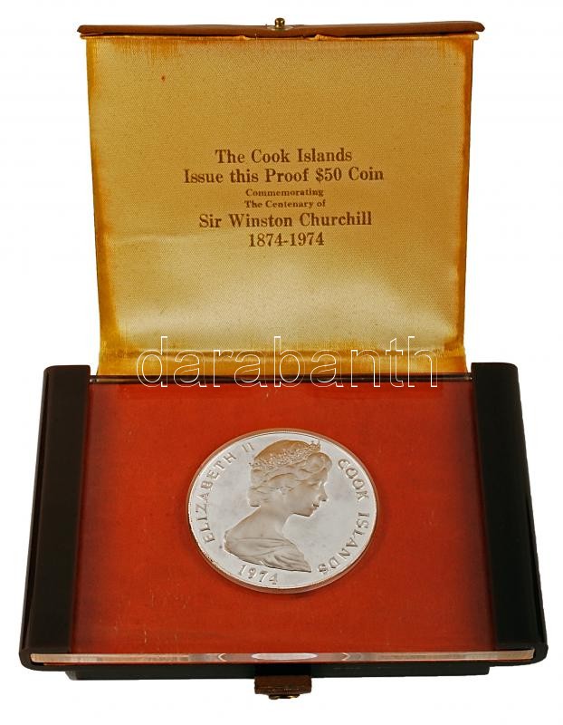 Cook-szigetek 1974. 50$ Ag "II. Erzsébet / Winston Churchill Centenári... https://www.darabanth.com/en/16-Major-auction/16.1/Numismatics/Foreign-precious-and-metal-coins~4863/Cook-szigetek-1974-50USD-Ag-II-Erzsebet-Winston-Churchill-Centenarium-disztokban-TPP-Csak-25~II701044