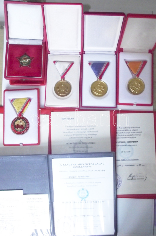 Description: ~1960-70. 4db klf Honvédelmi Érdemérem 10,20,25,30 év után mindegyik dísztokban, 3db adományozói okirattal + Munkásőr kitüntetés eredeti dísztokban T:1,2