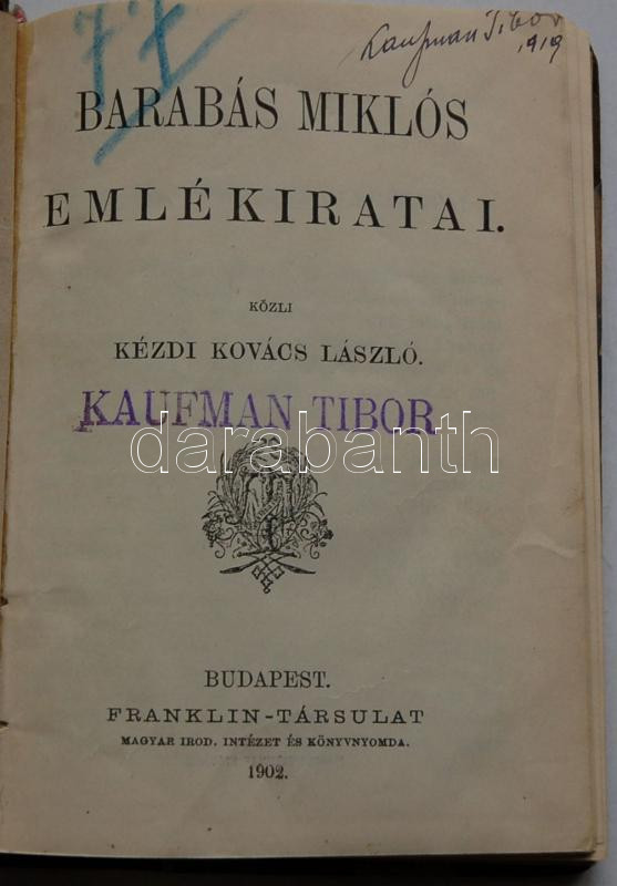 Barabás Miklós emlékiratai. Közli Kézdi Kovács László. Bp, 1902, Frank...