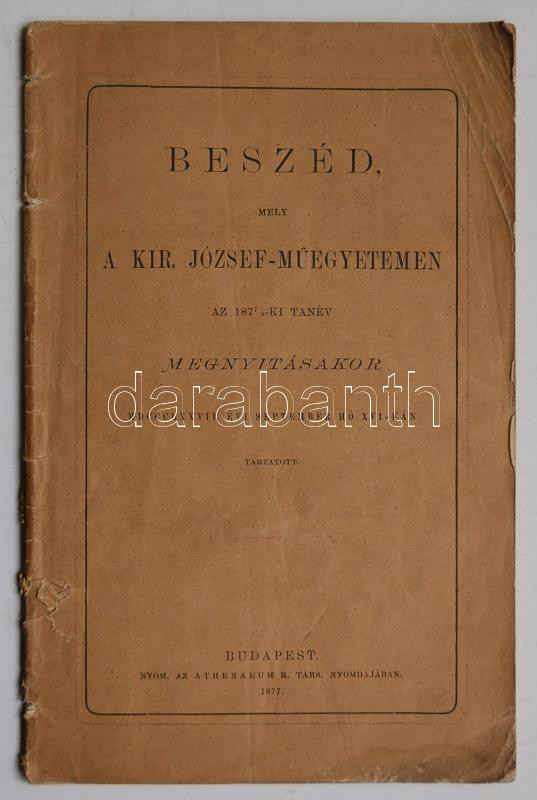 Beszéd, mely a kir. József-műegyetemen az 1877/1878-ki tanév megnyitás... https://www.darabanth.com/en/160-Online-auction/160.0/Other-collectibles/Books-Other-rarities~2000031/Beszed-mely-a-kir-Jozsef-muegyetemen-az-18771878-ki-tanev-megnyitasakor-MDCCCLXXVII-evi-se~II510975