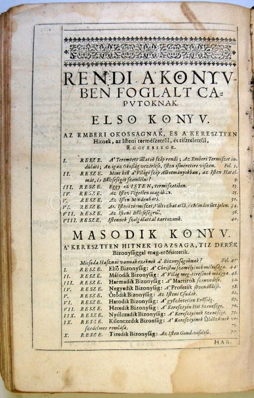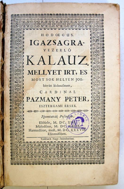 Pázmány Péter: Hodoegus. Igazságra-vezerlö kalauz, mellyet irt, es most sok helyen jobbitván ki-bocsátott, cardinal.. Posonban, 1637. typ. Soc. Jesu. 1073p. Harmadik kiadás. A ritkább B variáns egy darabja. A cÃmlap alján itt „Találtatik Nagy-Szombatban” olvasható, az utolsó levélen pedig a szöveg alatt és fölött is „IHS” feliratú könyvdÃsz áll. Enyhén sérült gerincű, kopottas, korabeli bÅ‘rkötésben