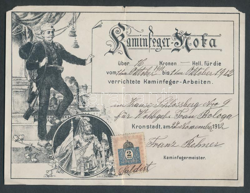 1912 Brassói dekoratív kéményseprő számla 2f okmánybélyeggel