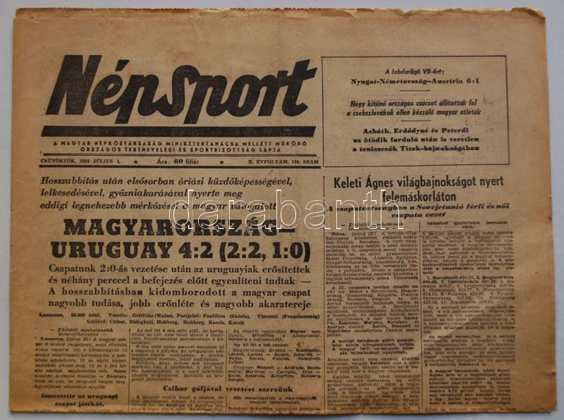 1954. július 1. Népsport: beszámoló a labdarúgó világbajnokság Magyarország-Uruguay (4:2) mérkőzésésről
