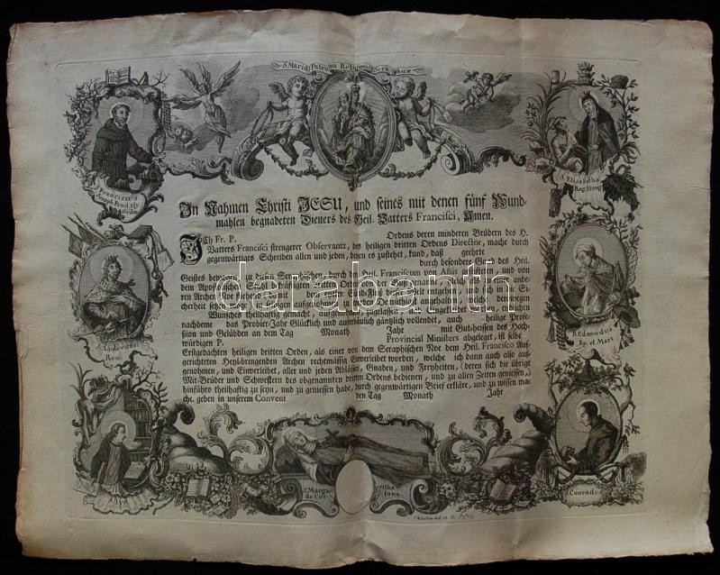 cca 1790 Ferences rendi díszes igazoló oklevél magyar és egyetemes sze... https://www.darabanth.com/en/161-Online-auction/161.0/Other-collectibles/Historical-documents-manuscripts~500005/cca-1790-Ferences-rendi-diszes-igazolo-oklevel-magyar-es-egyetemes-szentek-acelmetszetes-kepei~II519903