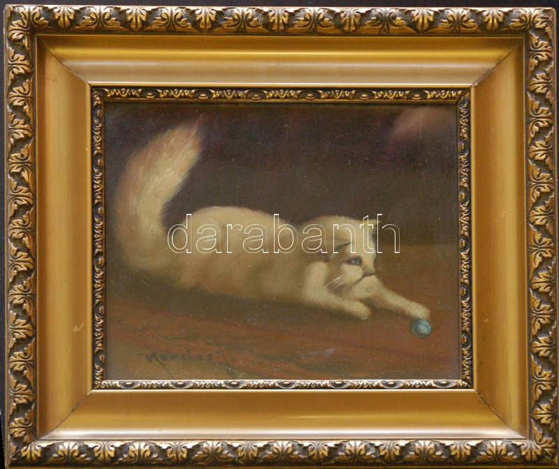 Kovács J. jelzéssel: Macska üveggolyóval, olaj-farost, szép, díszes fakeretben 29x26cm