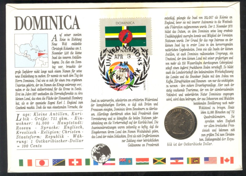 Description: Kelet-Karibi Államok 1987. 25c érmés borítékon Dominikai bélyeggel + hátlapon első napi bélyegzős ENSZ bélyeggel T:1