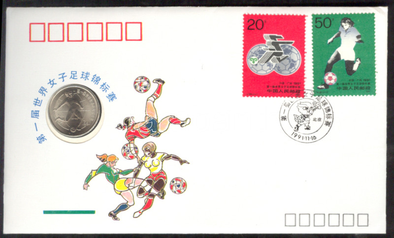 Kína 1991. 1Y "Női labdarúgó VB - játékos" érmés borítékon alkalmi bél... https://www.darabanth.com/en/162-Online-auction/162.0/Numismatics/Envelopes-with-Coins-and-Banknotes~1000130/Kina-1991-1Y-Noi-labdarugo-VB--jatekos-ermes-boritekon-alkalmi-belyegzos-belyegpar~II526435