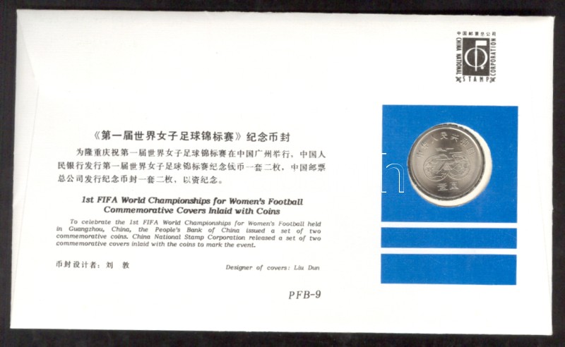 Description: Kína 1991. 1Y "Női labdarúgó VB - játékos" érmés borítékon alkalmi bélyegzős bélyegpárral, hátoldali ismertetővel T:1
