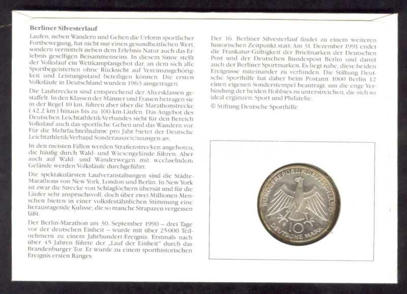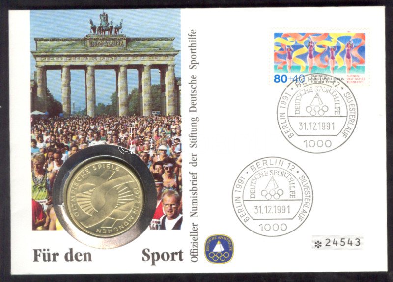 Description: NSZK 1972F. 10M Ag "Müncheni olimpia" érmés borítékon alkalmi bélyegzős bélyeggel, hátoldali ismertetővel T:BU