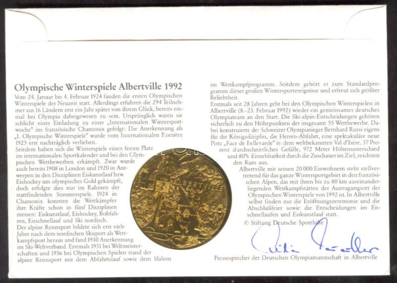 Németország 1992. "Téli olimpia - Albertville" Ffm bélyeges érmés borítékon, elsőnapi bélyegzővel T:1 hátoldali ismertetővel