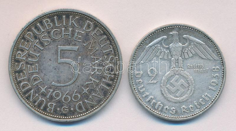 https://www.darabanth.com/en/162-Online-auction/162.0/Numismatics/Foreign-coins~1000139/Nemet-3-Birodalom-1938A-2M-Ag-Hindenburg-plus-NSZK-1966G-5M-Ag-T2--3Cbr3EGerman-Third-Reich-1938A-2~II524947