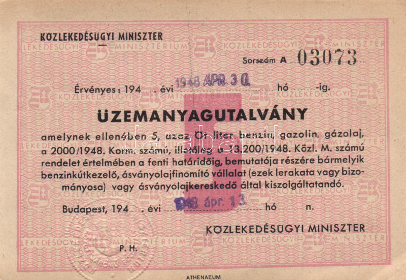 Budapest 1948. Közlekedésügyi Minisztérium Üzemanyagutalványa 5 liter ...