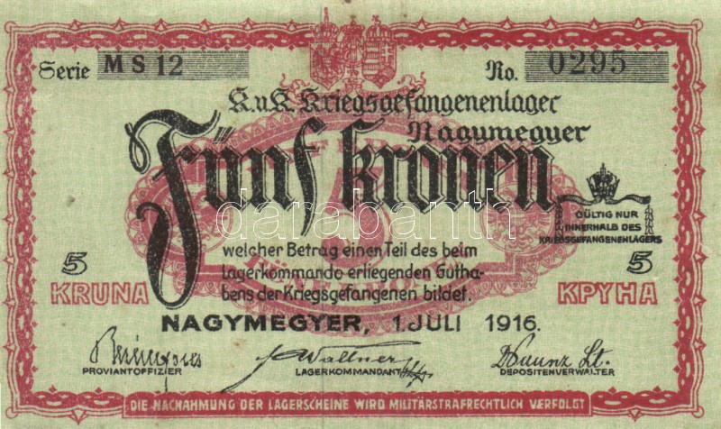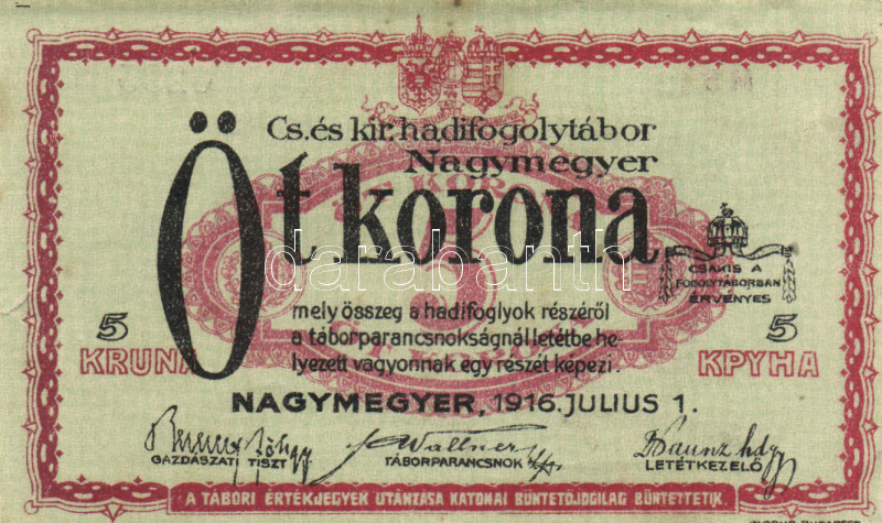 https://www.darabanth.com/en/162-Online-auction/162.0/Numismatics/Hungarian-and-foreign-emergency-notes-and-coins-tokens~1000133/Nagymegyerhadifogolytabor-1916-5K-arab-sorozat-es-sorszammal-MS-jelzessel-TIIhajtatlan-sze~II524712