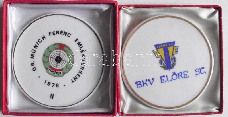 1976. "Dr. Münich Ferenc Emlékverseny" Hollóházi porcelán plakett (86mm) + DN "BKV Előre SC" Hollóházi porcelán plakett (86mm) T:1 mindkettő dísztokban