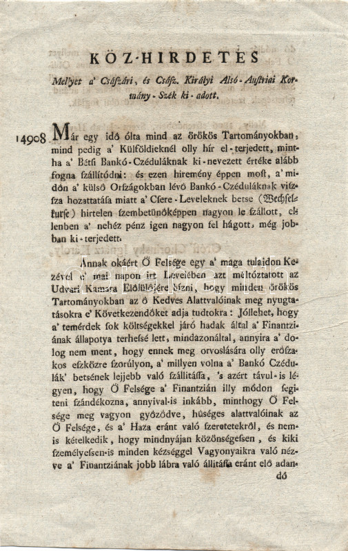 1806 Közhirdetés a bankócédulák értékromlásáról és jövőbeli intézkedés... https://www.darabanth.com/en/162-Online-auction/162.0/Numismatics/Numismatics-documents-and-letters~1000129/1806-Kozhirdetes-a-bankocedulak-ertekromlasarol-es-jovobeli-intezkedesek-eletbe-lep~II520360