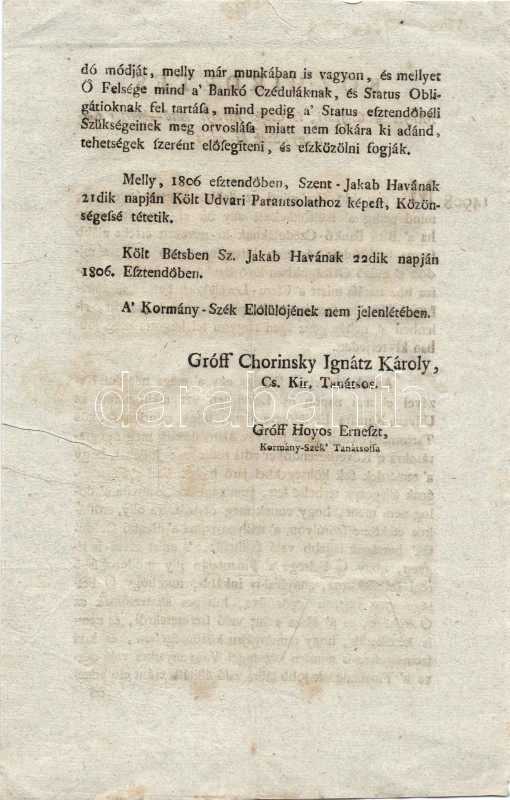 Description: 1806 Közhirdetés a bankócédulák értékromlásáról és jövőbeli intézkedések életbe léptetéséről Gróf Chorinsky Ignátz Károly Cs. Kir. Tanátsos és Gróf Hoyos Erneszt kormányszéki tanácsos nevén kiadva