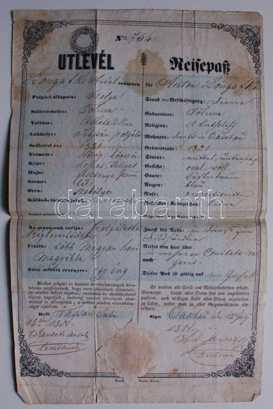 https://www.darabanth.com/en/162-Online-auction/162.0/Other-collectibles/Documents~1000004/1851-Utlevel-Kassa-6kr-szignettaval-hatoldalt-sok-bejegyzessel-1858-Passport-Kosice-with-6kr-~II525171