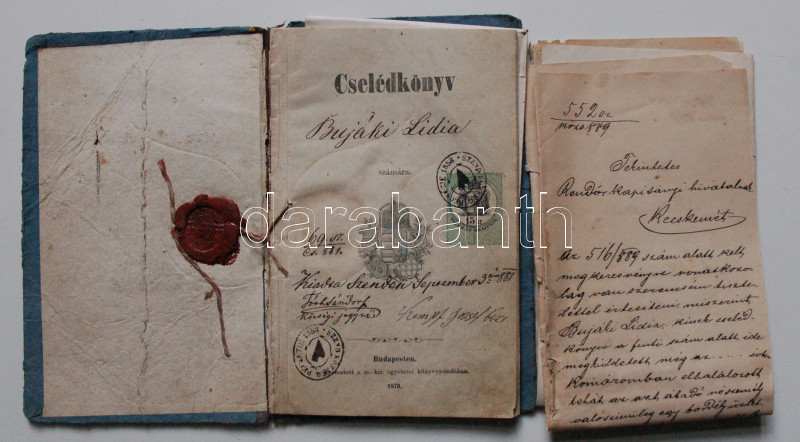 1889 Bujáki Lidia cselédkönyve, hozzá tartozó hivatalos irattal, illet... https://www.darabanth.com/en/162-Online-auction/162.0/Other-collectibles/Historical-documents-manuscripts~1000005/1889-Bujaki-Lidia-cseledkonyve-hozza-tartozo-hivatalos-irattal-illetekbelyeggel-ezust-pe~II525184