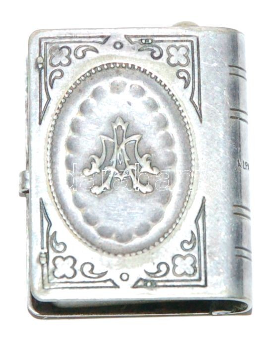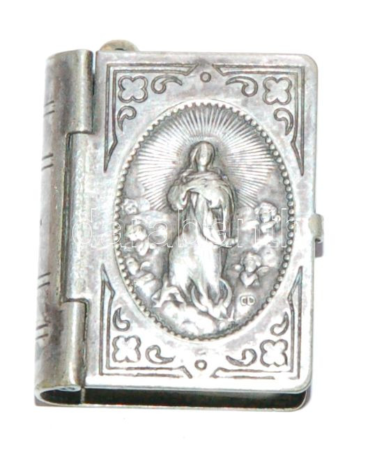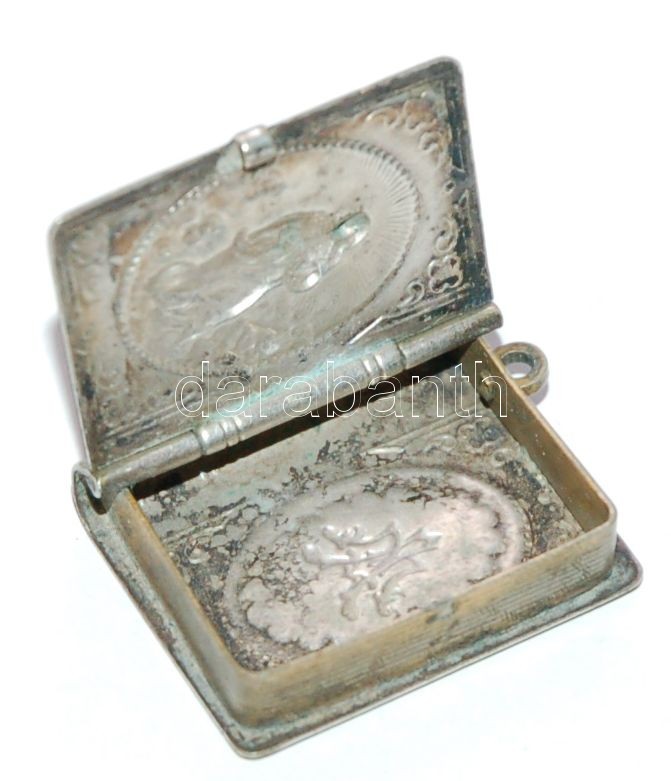 Nyakba akasztható ezüstözött minikönyvtartó a fedelén Krisztust ábrázo... https://www.darabanth.com/en/164-Online-auction/164.0/Other-collectibles/Flea-Market~500012/Nyakba-akaszthato-ezustozott-minikonyvtarto-a-fedelen-Krisztust-abrazolo-dombormuvel--3Cb~II536382