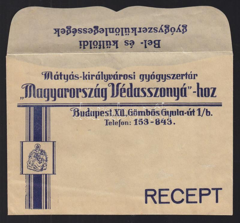 1941 A Mátyás-királyvárosi gyógyszertár "Magyarország Védasszonyá"-hoz receptborítéka recepttel