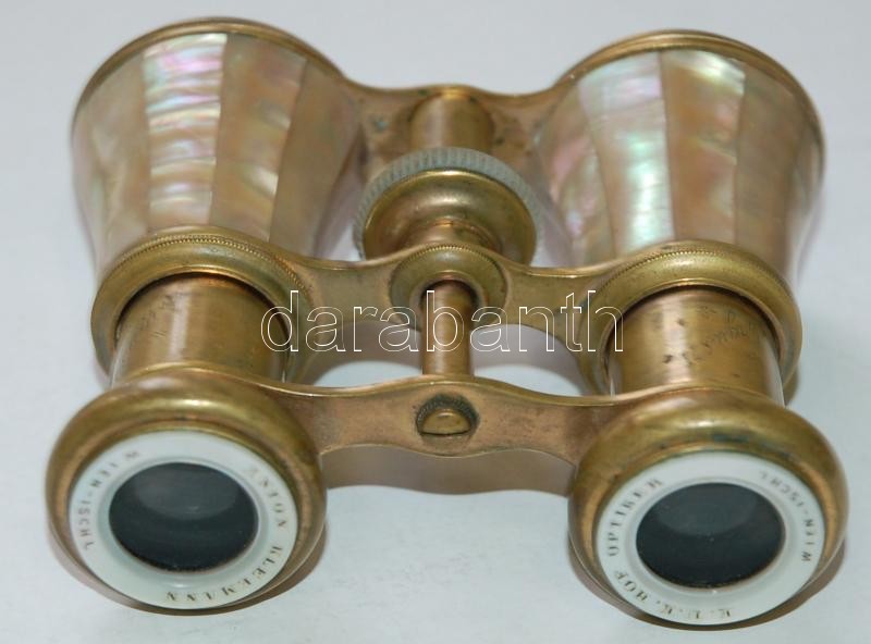 Description: cca 1900 Anton Kleemann k. u. k. Hof-Optiker Wien-Ischl Argus II típusú, optikán és törzsön is jelzett, gyöngyházberakású, réz színházi látcső kiváló állapotban /