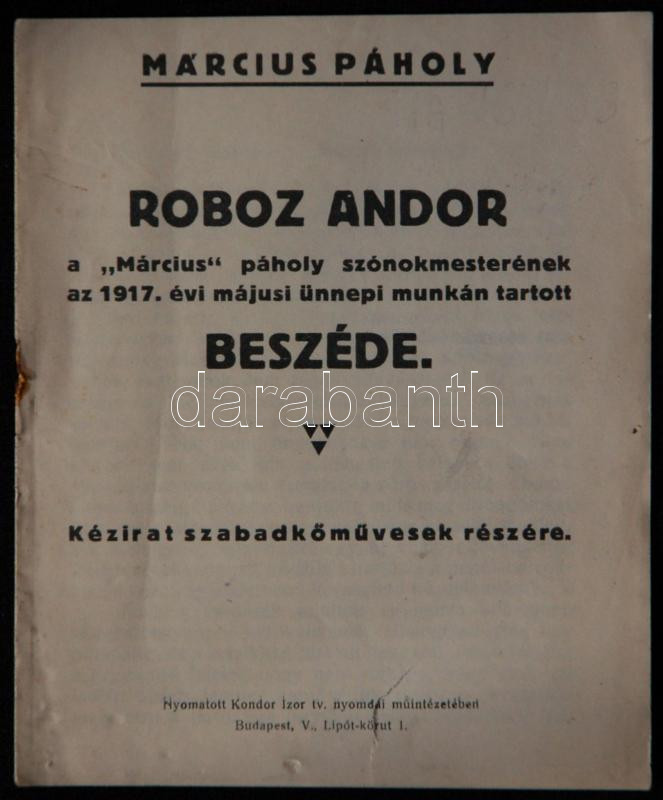https://www.darabanth.com/en/165-Online-auction/165.0/Other-collectibles/Books-Freemason~900034/Szabadkomuvesseg-Roboz-Andor-A-marcius-paholy-szonokmesterenek-az-1917-evi-unnepi-munka~II548699