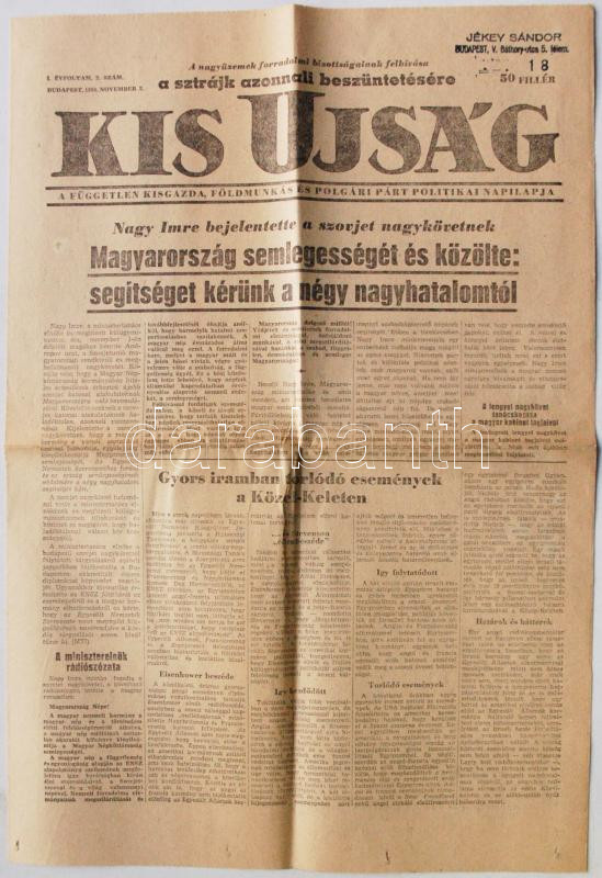 https://www.darabanth.com/en/165-Online-auction/165.0/Other-collectibles/Historical-documents-manuscripts~900015/1956-nov-2-A-Kis-Ujsag-c-ujsag-2-szama-a-forradalom-hireivel-jo-allapotban~II534817