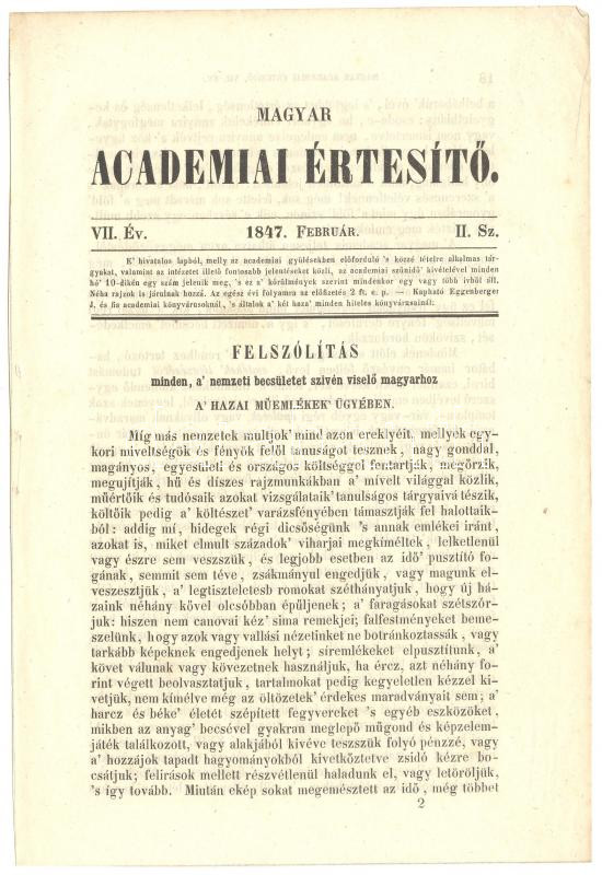 Description: 1847 Schedel (Toldy) Ferencz: Felszólítás minden, a' nemzeti becsületet szivén viselő magyarhoz a' hazai műemlékek' ügyében, in Magyar Academiai Értesítő, VII/2, pp17-19, folyóirattöredék a teljes cikkel