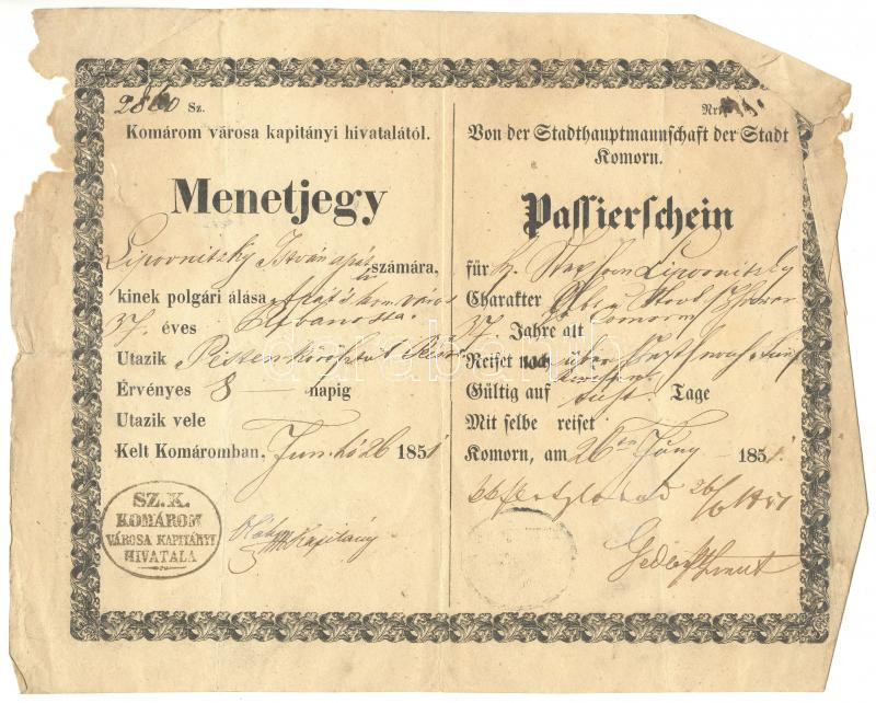 1851 2db Menetjegy Komárom városa kapitányi hivatalától magyar és ném...
