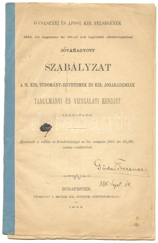 https://www.darabanth.com/en/165-Online-auction/165.0/Other-collectibles/Printed-Materials~900025/1883-A-M-kir-Tudomanyegyetemek-es-Jogakademiak-tanulmanyi-es-vizsgalati-rendjenek-szabaly~II546014