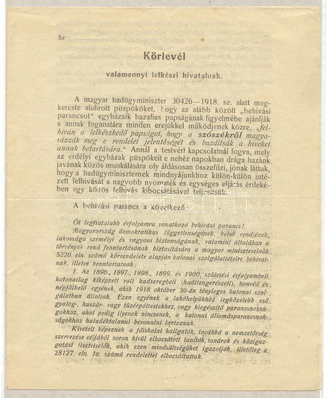 1919 Körlevél - közös püspöki felhívás a katonák bevonultatására