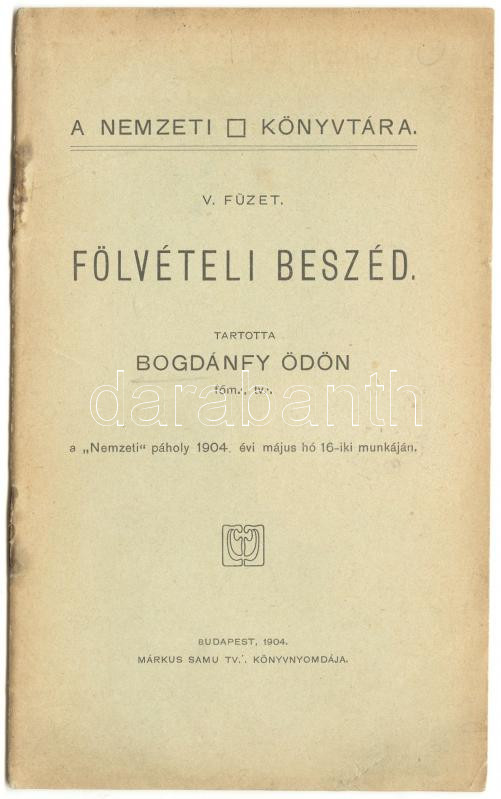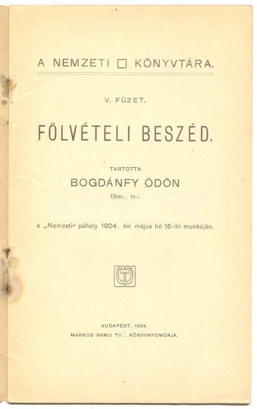 Szabadkőművesség: Bodgánfy Ödön: Fölvételi beszéd. Bp., 1904. Nemzeti ...