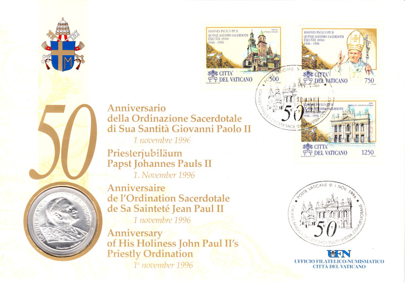 Vatican 1996. 500 Lire Ag(0.835) "50th Anniversary - Ordination of Pope John Paul II" coin letter with first day of issue stamps C:Unc