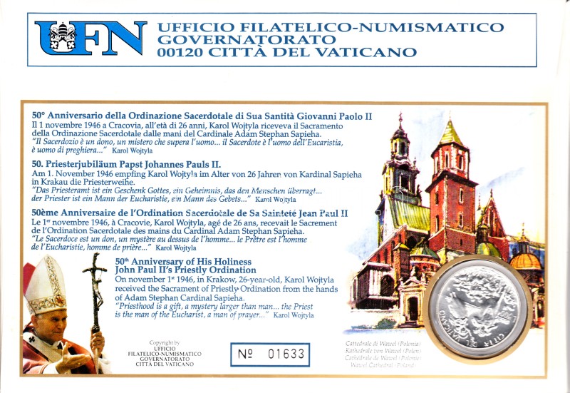 Vatikán 1996. 500L Ag(0.835) "50 éve szentelték pappá II. János Pált" ... https://www.darabanth.com/en/168-Online-auction/168.0/Numismatics/Envelopes-with-Coins-and-Banknotes~2000349/Vatikan-1996-500L-Ag0835-50-eve-szenteltek-pappa-II-Janos-Palt-ermes-boritek-elson~II562034
