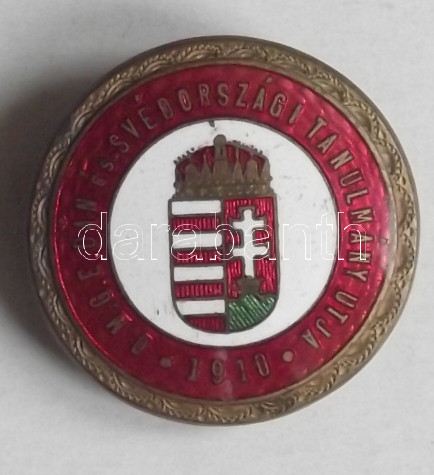 1910. "Országos Magyar Gazdasági Egyesület Dán és Svédországi tanulmányi útja" zománcozott jelvény (d=29mm) szign.: Morzsányi J. Budapest T:2