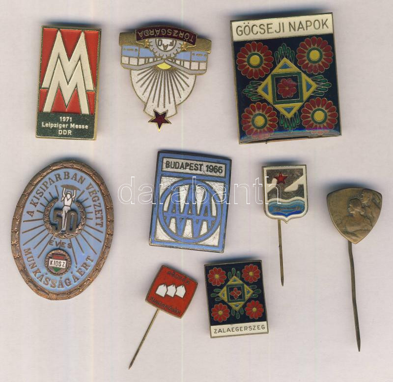 Description: 9db különféle jelvény, közte "FAÜ" törzsgárda aranyozott tűzzománc jelvény, "A Kisiparban Végzett 50 éves Munkásságáért" zománcozott jelvény, "Pécsi Országos Kiállítás 1907" Br jelvény T:1-,2
