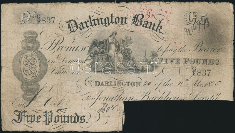 Nagy-Britannia/Darlington Bank 1885. 5Ł aláírások kivágva, így érvényt... https://www.darabanth.com/en/168-Online-auction/168.0/Numismatics/Foreign-banknotes~2000357/Nagy-BritanniaDarlington-Bank-1885-5C581-alairasok-kivagva-igy-ervenytelenitve-TIV-3Cbr3EGr~II562397
