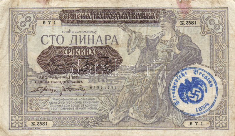 https://www.darabanth.com/en/168-Online-auction/168.0/Numismatics/Foreign-banknotes~2000357/SzerbiaNemet-megszallas-1941-100D-Strafgericht-Breslau-1834-belyegzovel-ellatva-TIII-3Cbr~II560947