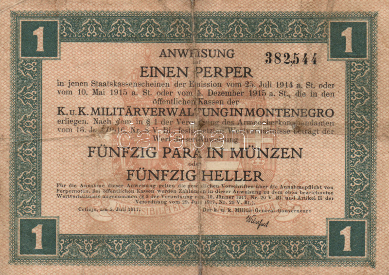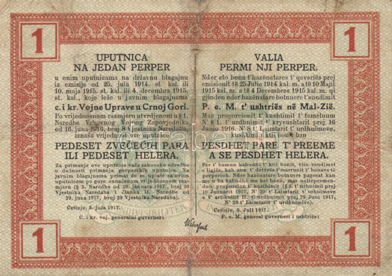https://www.darabanth.com/en/168-Online-auction/168.0/Numismatics/Hungarian-and-foreign-emergency-notes-and-coins-tokens~2000352/MontenegroCetinje-1917-KuK-utalvany-1-perperrol-TIII-3Cbr3EMontenegroCetinje-1917-KuK-~II562344