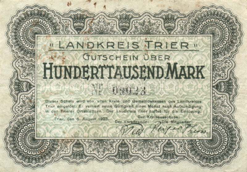 Német Birodalom/Weimari Köztársaság/Trier 1923.8.6. 100.000M + Pforzhe...