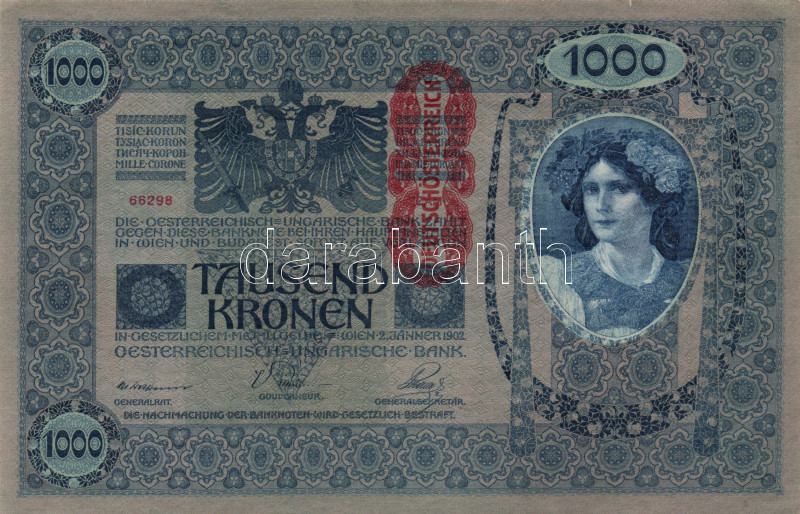 https://www.darabanth.com/en/168-Online-auction/168.0/Numismatics/Hungarian-banknotes~2000353/1902-1000K-nemet-mindket-oldal-Deutschosterreich-felulbelyegzessel-TIIhajtatlan-kis-papi~II562139