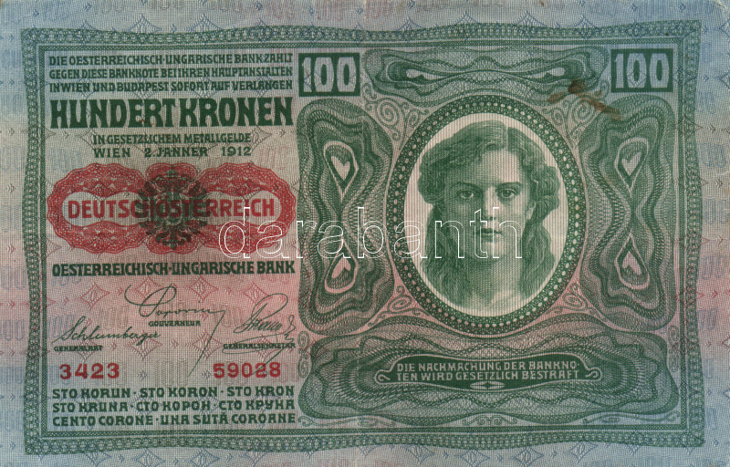 https://www.darabanth.com/en/168-Online-auction/168.0/Numismatics/Hungarian-banknotes~2000353/1912-100K-nemet-mindket-oldal-Deutschosterreich-felulbelyegzessel-TII-kis-papirszakadas~II562142