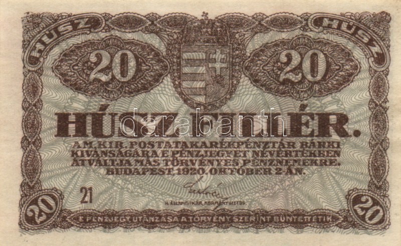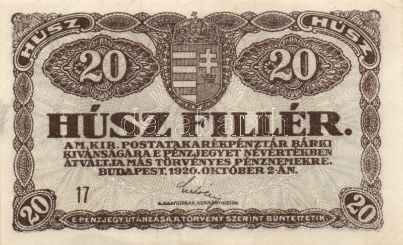 https://www.darabanth.com/en/168-Online-auction/168.0/Numismatics/Hungarian-banknotes~2000353/1920-20f-2x-eltero-szinvaltozatok-plus-50f-plus-1K-2x-plus-20K-2x-TI-II-II-~II560928