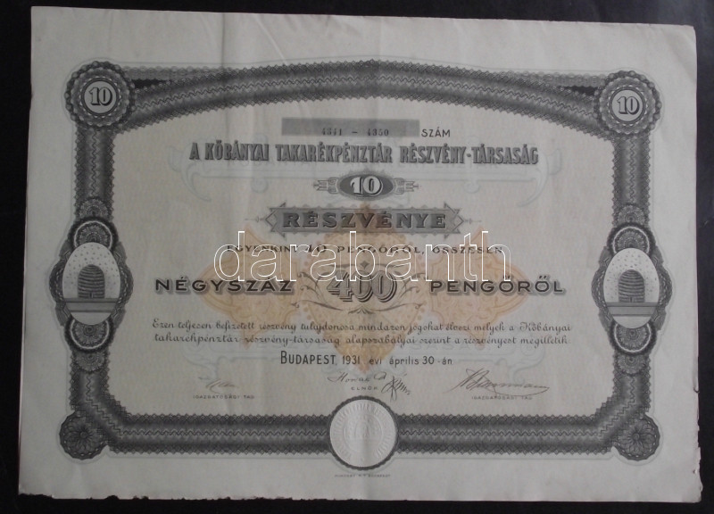 https://www.darabanth.com/en/168-Online-auction/168.0/Numismatics/Shares-and-Tickets~2000351/1931-A-Kobanyai-Takarekpenztar-Reszveny-Tarsasag-reszvenye-400P-rol-szelvenyekkel-s~II561681